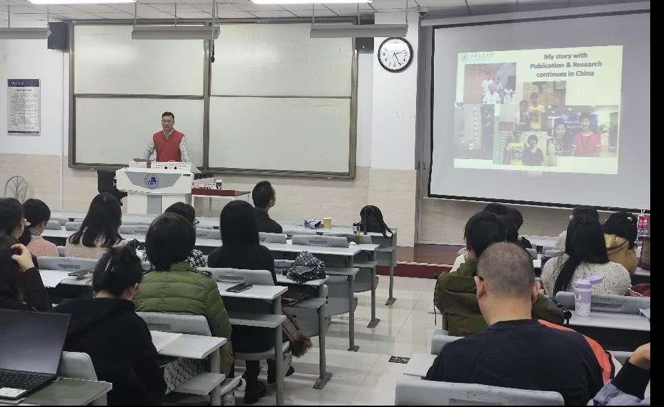 11月13日下午,西安交通大学高洋博士受邀做客我院“英华学术论坛”第49期,作了题为《国际期刊论文选题与发表》的学术报告。本次学术报告由外国语学院院长张慧军主持,外国语学院师生80余人在四教阶3参加讲座。
