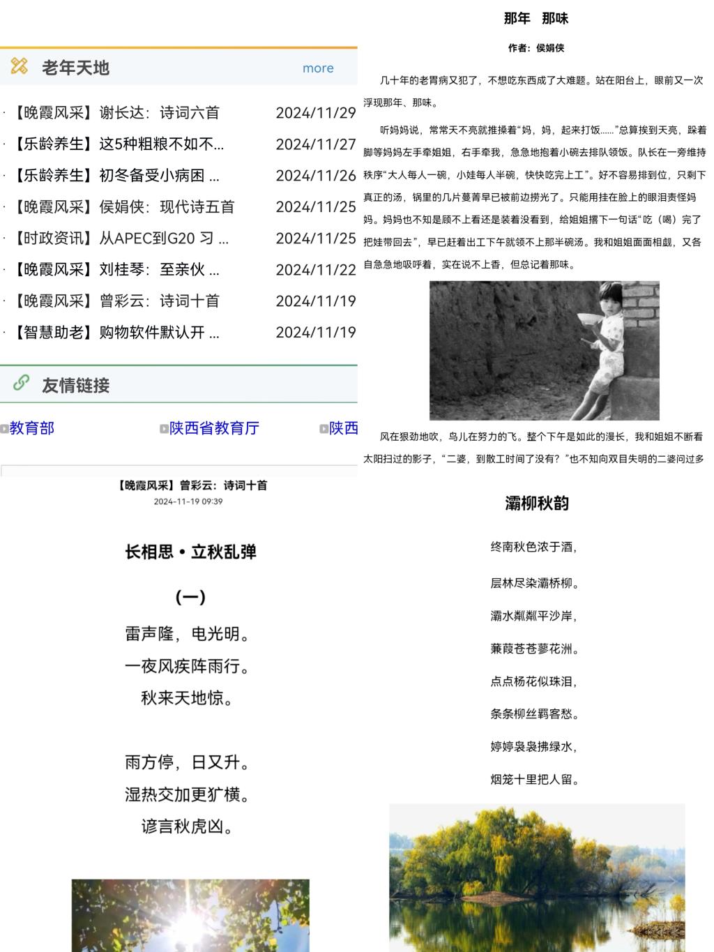 自今年十月份以来,为更好地服务离退休老同志退休生活需求,丰富离退休老同志的精神文化活动,展现bat365离退休老同志“老有所学、老有所乐、老有所为”的精神风貌,为老年群体搭建一个可以学习知识、展示才艺、交流心声的平台,增强老年群体的归属感和幸福感,离退休工作处对“老年天地”专栏进行了改版设计,先后增设了【晚霞风采】、【智慧助老】、【乐龄养生】、【时政资讯】等版块,努力为离退休老同志提供多样化的网络学习需求。与此同时,重点针对“晚霞风采”进行推介,动员鼓励老同志们将记录退休生活的见闻感受、生活体验及书法绘画摄影作品等,以文字或图片的形式向离退休工作处网页“老年天地”专栏投稿。征稿活动开展以来,极大地激发了老同志们的创作热情,受到老同志们的普遍关注和积极响应。截止目前,征稿先后收到散文、诗词、书法、摄影、随笔等投稿100余件,经离退休工作处审核编辑后,已在部门网页“老年天地”专栏【晚霞风采】陆续发布11期,供全校师生浏览欣赏。