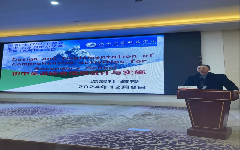 bat365外国语学院温宏社教授应国家开放大学邀请于2024年12月8日参加在贵州革命文化研究中心举办的“国培计划(2024)”-整县推进-习水县中小学英语种子教师能力提升培训项目,做了题为“初中英语综合活动设计与实施”的专题讲座。“国培计划(2024)”-整县推进-习水县中小学英语教师能力提升培训项目是由贵州省教育厅发文,国家开放大学组织。项目旨在贯彻习近平新时代中国特色社会主义思想和党的二十大精神,落实《中共中央国务院关于全面深化新时代教师队伍建设改革的意见》《新时代基础教育强师计划》要求。项目培训于12月4日-12月8日举行,培训中小学英语种子教师100人。温宏社教授讲座围绕初中英语综合活动设计与实施,内容涵盖概述、理论基础、设计原则、教学活动设计、综合活动的设计与实施、综合活动案例分析、英语综合活动的教学资源七大部分。既包括初中英语综合活动设计理念、理论,又包括初中英语综合活动设计实践及典型案例。既有精彩的视频呈现,又带有较多亲手制作的教学工具,讲座激情饱满,极具感染力。