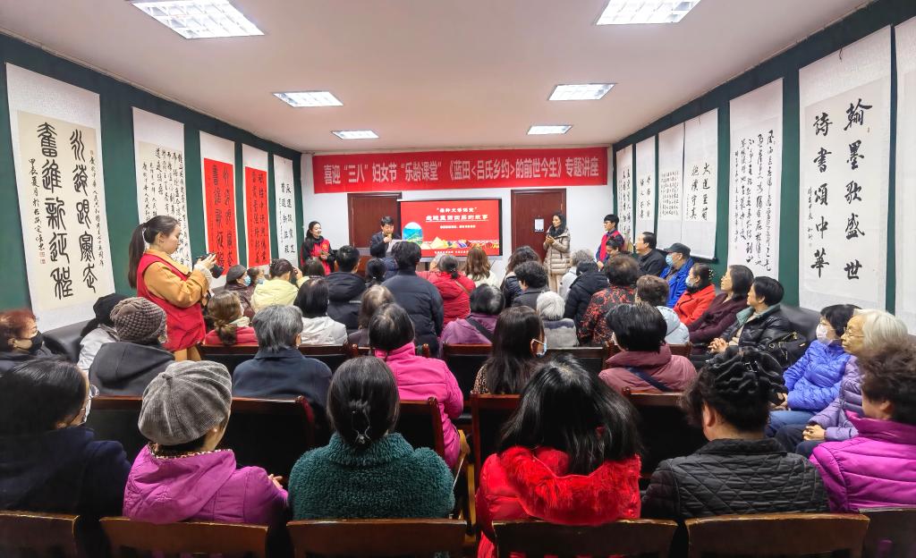 在首先开展的“乐龄课堂”——《蓝田<吕氏乡约>的前世今生》专题讲座上,陕历博志愿者丁珊珊老师以吕氏家族墓葬被盗经历和出土文物为切入点,通过视频演绎及图片介绍等多种方式,详细向大家讲述了北宋蓝田吕氏家族“德业相劝、过失相规”的乡治智慧。讲座现场,丁老师抛出“吕大钧兄弟为何要在乡村推行《吕氏乡约》”、“刻在石头上的家训如何影响百姓生活”等互动式问答,引发大家的热烈讨论,老同志们的精彩发言赢得了现场的阵阵掌声。