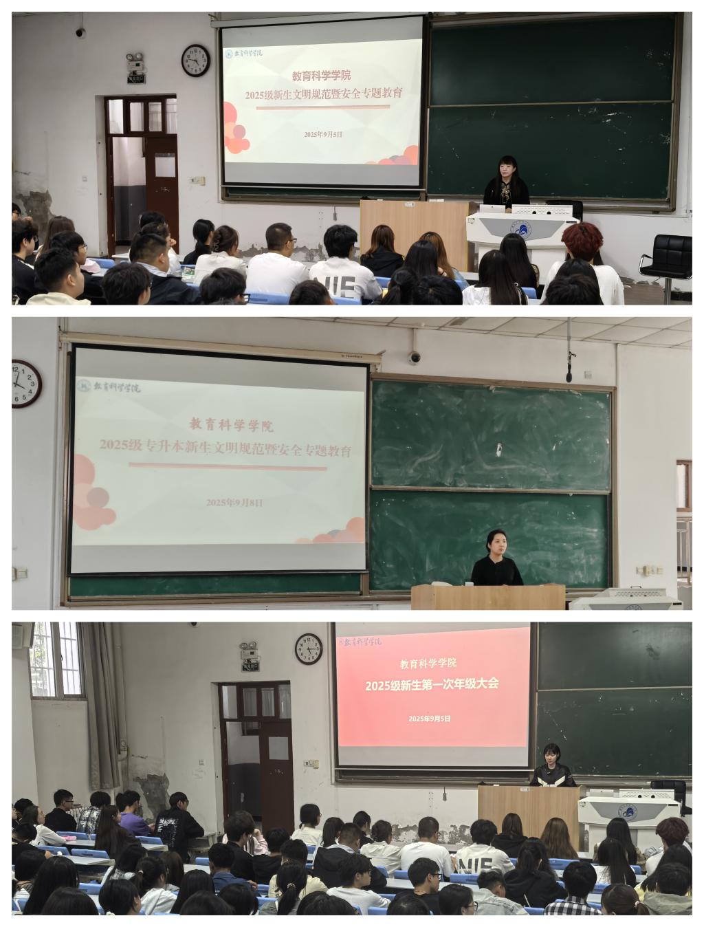 为帮助新生更好地适应大学生活,树立文明规范,强化安全防护意识,教育科学学院分批次、分专业在2025级新生中开展文明规范暨安全稳定专题教育活动。学院相关负责人、新生辅导员、老生代表及2025级全体新生参加专题教育。