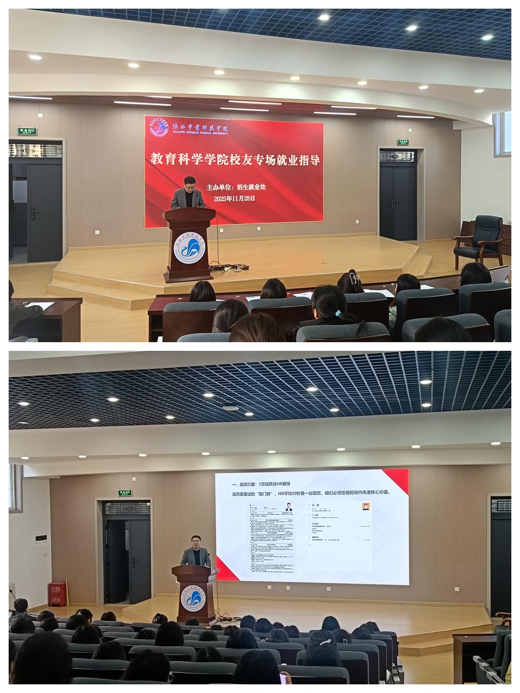 教育科学学院2006级校友、陕西佳诚人才集团有限公司总经理张雷委派公司人事经理童佳以“简历优化与面试”为主题为教育科学学院的学子开展专题就业指导。童佳结合自身人力资源从业经验,以企业招聘视角为核心,讲解了求职全流程关键点。针对简历制作,他指出“精准匹配”的重要性,通过真实案例对比,详细讲解了简历结构优化、核心经历提炼、关键词适配等实用技巧,提醒同学们避免“模板化堆砌”,用数据化成果凸显个人优势。