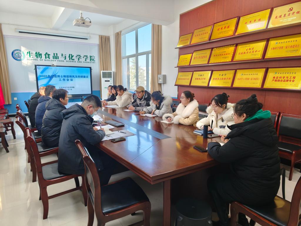 1月7日下午,生物食品与化学学院召开新进博士师德师风暨科研诚信专题座谈会,为2025年新进的10名博士教师上好“廉洁从教第一课”。学院党政主要负责人出席会议,2025年新进10名博士教师参会。座谈会由党委副书记主持。