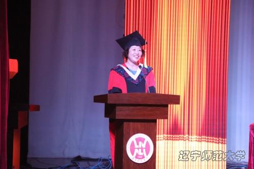 教师代表、国际法教研室主任姚玉杰致辞。她首先对毕业生顺利获得学位表示祝贺,同时也表达对同学们的不舍,希望在未来的道路上,他们将有更宽广的舞台。最后,她赠送了三句话:要奋斗,要有理想目标,心有多大,舞台就有多大;要尊重自己,同时尊重他人;不怕困难,勇往直前。
