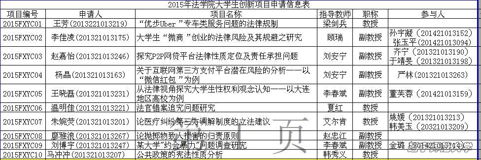 法学院2015年度大学生创新训练项目立项情况