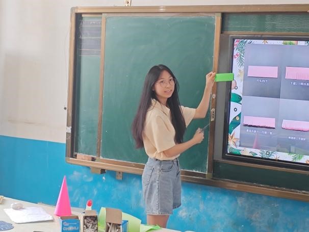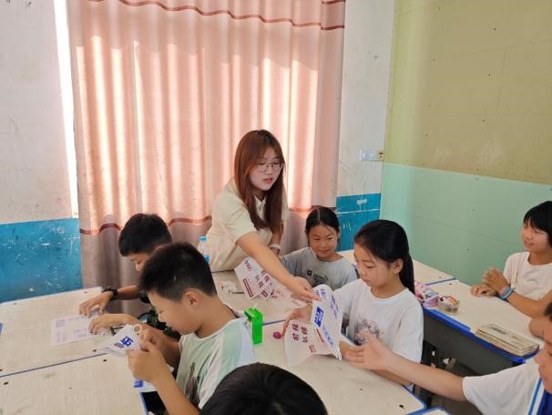 七月,我满怀着憧憬与期待开启了人生中第一次支教生活。在这次支教活动中,我是孩子们的美术老师,为孩子们带来绘画课程以及折纸课程。当我让孩子们画画、折纸时,他们的作品都十分出色,那一刻作为传授者的自豪感油然而生。在这个蝉鸣不止的夏天,他们拿着小小的画笔,在白纸上尽情描绘着属于他们的五彩斑斓的世界。同时在这场活动里,我也幸运地遇见了志同道合的伙伴,我们的革命友谊在无数个美好瞬间中慢慢缔结。我们相遇在夏天,就像风遇见云,花遇见树,萤火虫遇见星光。这一段支教旅程的结束,也为我们下一次出发积蓄了力量,激励我们保持热爱,奔赴下一场山海。