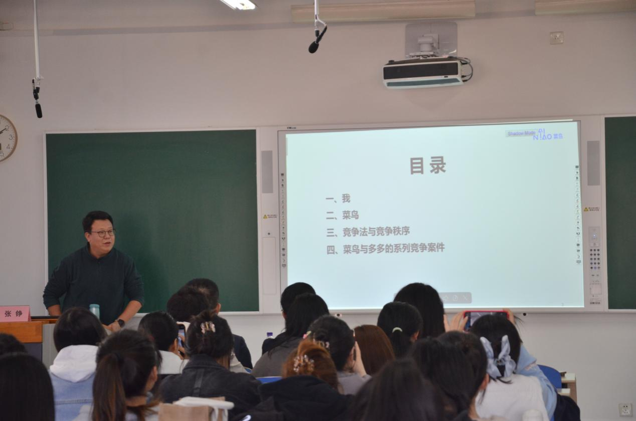 首先,张铮总监分享了他在互联网公司法务总监岗位上的工作历程与感思。深入剖析了菜鸟公司的发展历程、业务架构、竞争法与监管秩序等内容,并详细阐述了我国竞争法及体系的渊源、竞争执法机构的变迁,以及与竞争有关的法律与政策的发展变化。通过对这些内容的梳理,让师生们清晰地了解到我国竞争法律体系不断完善的过程。