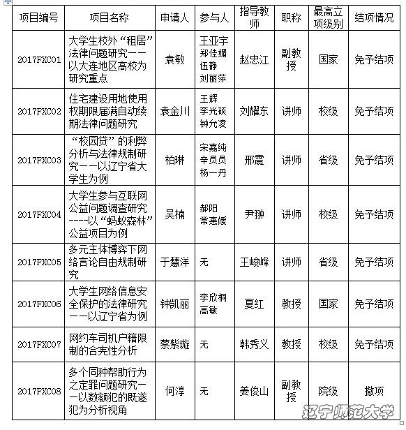 2017年法学院院内大创项目,共立项8项。在同学们的努力和指导教师悉心指导下,其中2项获批国家级、2项获批省级、3项获批校级大学生创新训练项目。经学院研究决定,达到校级以上的项目可以免予结项。其中有一项未能获批校级项目,经本人申请,同意撤销院级项目。
