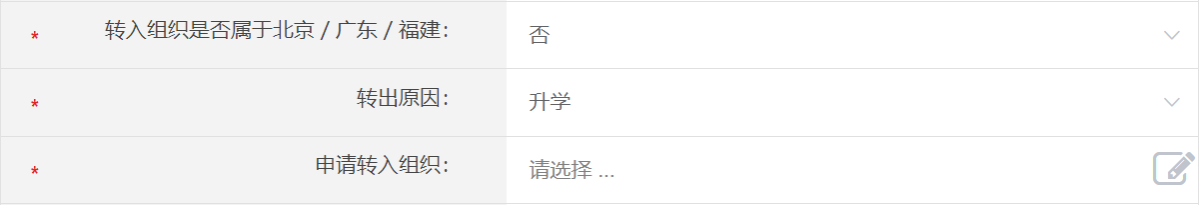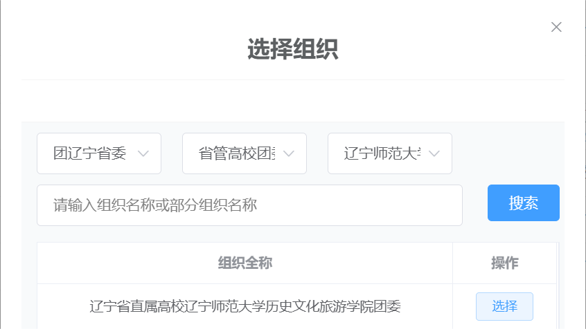 ③申请转入组织:点击选择“团辽宁省委”,“省管高校团委”搜索框内输入:“辽宁省省管高校万象城awcsport官网万象城awcsport官网”,之后在候选框中选择“万象城awcsport官网2025级研究生新生临时团支部”